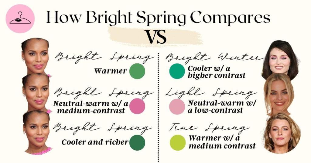 All these palettes share seasonal qualities, but Bright Spring uniquely combines clarity and contrast with a warm-leaning temperature.