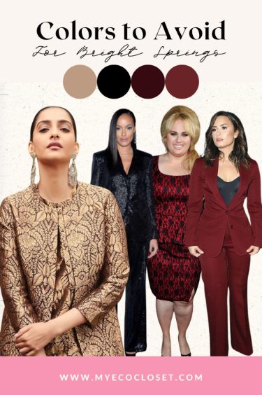 Black, charcoal, deep navy, burgundy, maroon, and eggplant are too heavy and overpowering for Bright Spring’s vibrant coloring. - Muted or Dusty Shades: