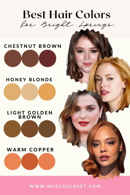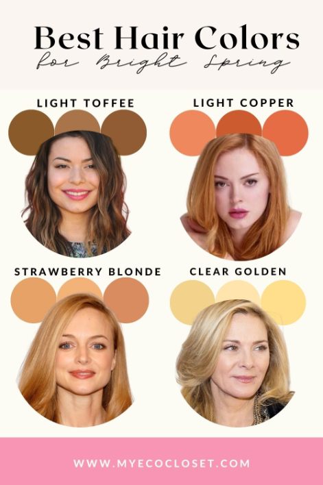The most flattering Bright Spring hair colors are clear, slightly warm, and light-reflective, echoing the brightness of the season’s palette. These include: honey caramel, coppery light brown, sunlit golden brown, and light strawberry blonde. These shades echo the lively palette: clear, bright, and never muted.