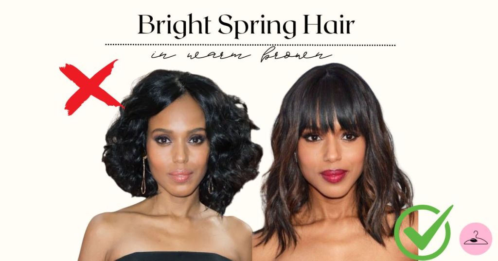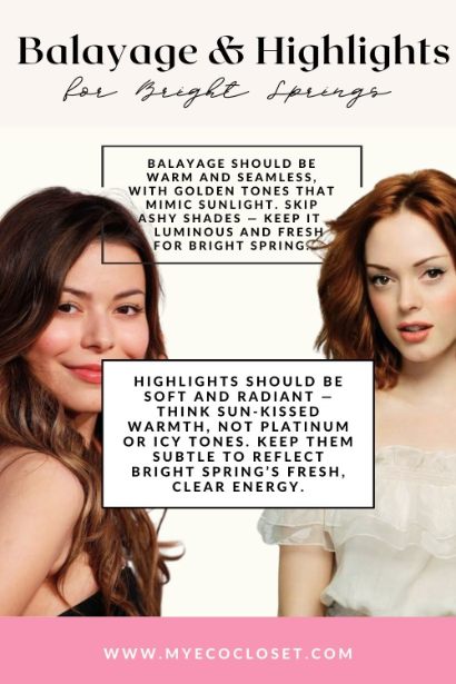 Very dark shades, like espresso or black, overpower the moderate contrast of Bright Springs. These colors tend to separate harshly from warm undertones. Medium golden browns or caramel shades are safer alternatives, keeping the look dimensional, warm, and clear without losing the season’s signature brightness.