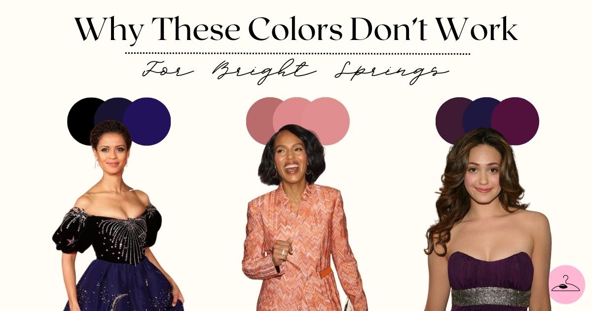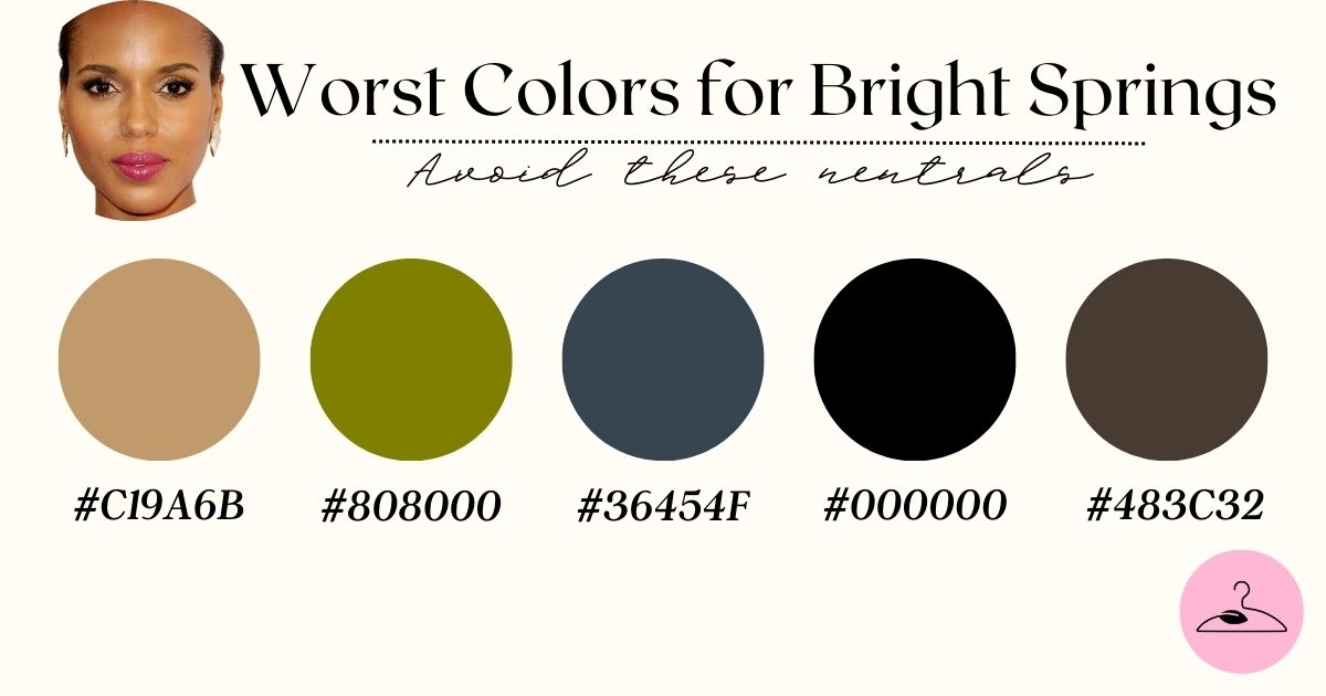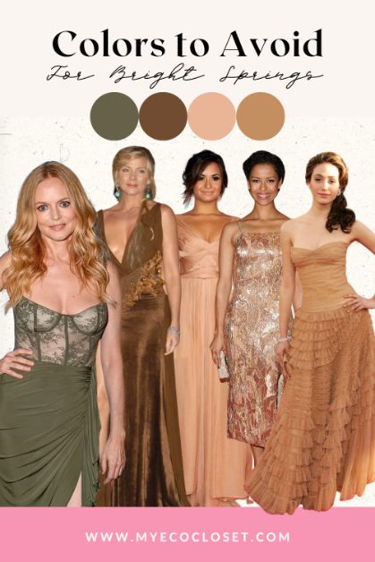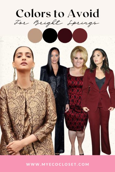 Bright Springs should steer clear of muted, dusty shades like taupe, olive, and grayish pastels. These tones dampen their natural clarity and make the complexion look dull. Instead, they shine in clear, bright colors with warmth and vibrancy that echo spring sunlight.