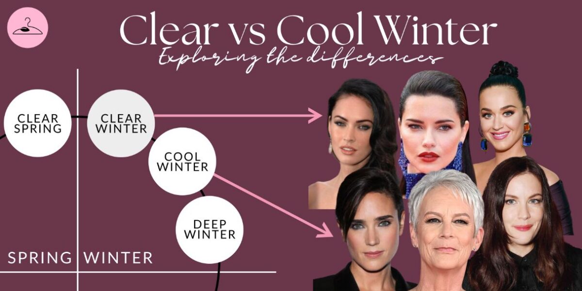 You can distinguish the two by evaluating undertones and contrast. Clear winters display sharp contrast between hair, eyes, and skin with a crystalline clarity, while cool winters retain blue undertones but appear softer, with medium to high contrast rather than vivid, high-definition coloring.