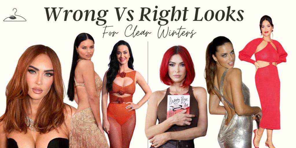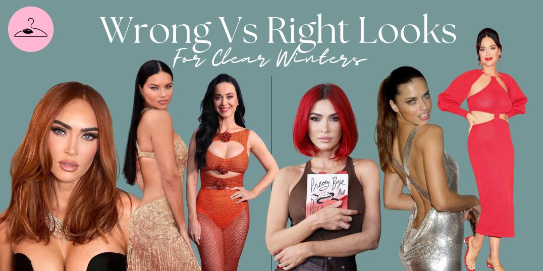 On the left, you’ll notice how warm, muted tones like Megan Fox’s brown hair, Katy Perry’s burnt orange outfit, and Adriana Lima’s gold dress wash them out. These shades water down their clear winter coloring, making them appear dull and unflattering.
