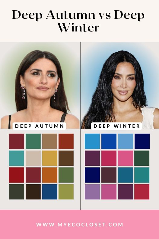 Deep Autumn is warm-toned with golden undertones, whereas Deep Winter is cool-toned with icy undertones. The former focuses on warm, earthy hues (pumpkin orange, olive green), while Deep Winter suits cool, high-contrast shades like royal blue and charcoal gray.