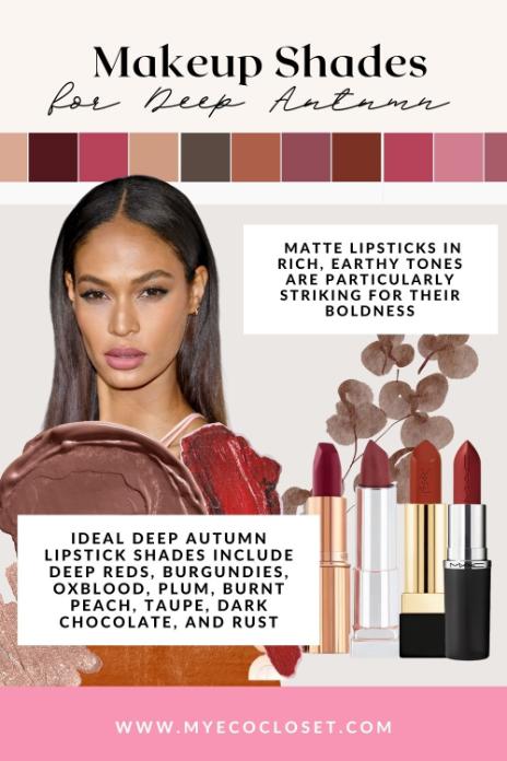 - Lipstick: Brick red, burnt orange, deep plum, and warm berry are the best colours for a deep autumn look.