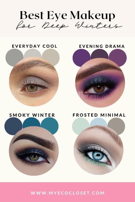 Deep Winter eyes are often dark brown, gray, or cool hazel, and they shine when framed by equally cool, saturated shades. For eyeshadow palettes, opt for the following: