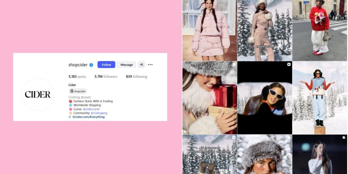 Flaunting the hashtag #cidergang, influencers post try-ons that double as user-generated ads. This strategy fuels the brand’s reach and trust factor, making Cider feel like a peer-to-peer discovery rather than a corporate campaign.