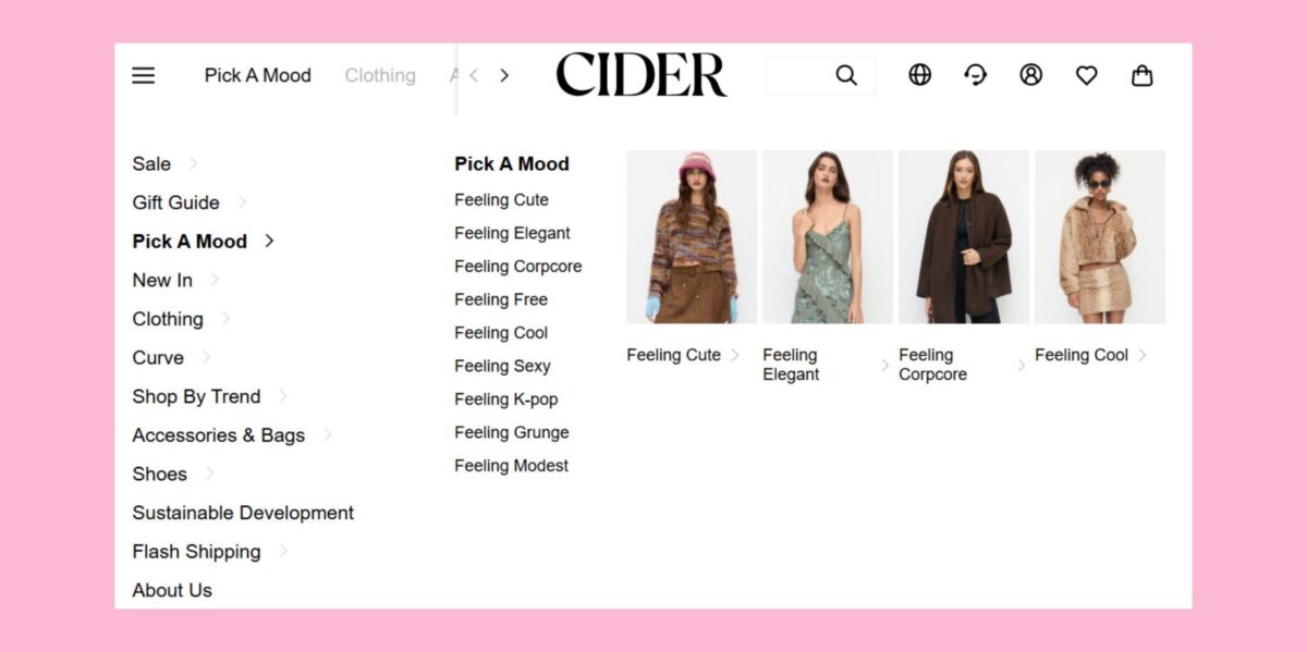 Cider invites shoppers to choose clothing by mood rather than need. Categories like “unbothered,” “grunge,” “nostalgic,” or “free” sound playful, but they encourage impulse-driven browsing instead of intentional selection. The experience may feel personalized and creative, but it quietly shifts the focus from wardrobe planning to momentary desire.