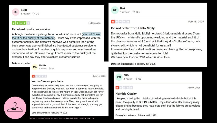 Few customers praise the fabric quality, and some frustrated buyers even claim Hello Molly’s clothes are worse than Shein’s. The brand’s inconsistent sizing only adds to the frustration, making it even harder to get a good fit.