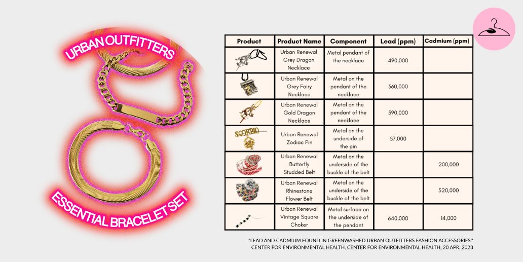 Perhaps the most troubling environmental (and health) revelation comes from the Center for Environmental Health (CEH). Their investigation found dangerously high levels of lead and cadmium in Urban Outfitters’ “Urban Renewal” collection. For context: