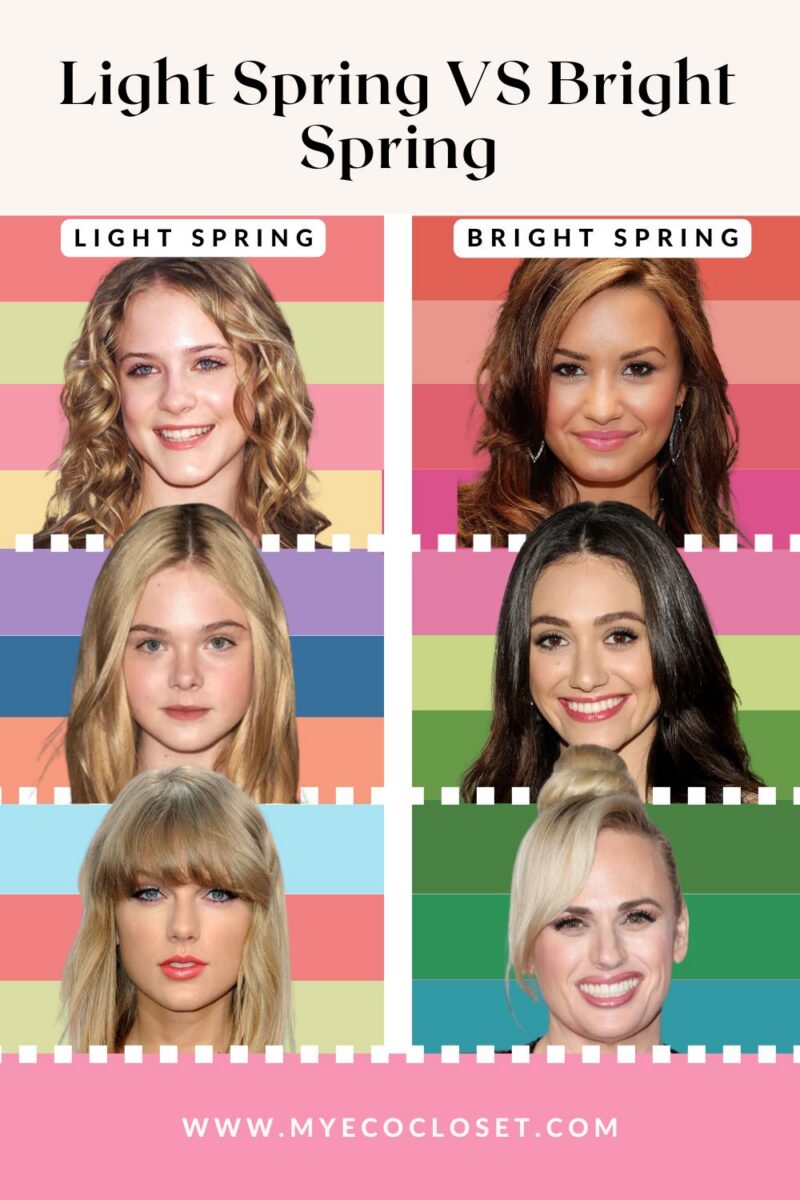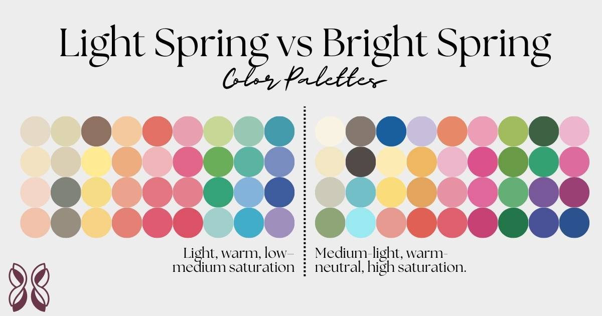 Both Light Spring and Bright Spring share warmth and clarity, but they diverge in value and intensity.