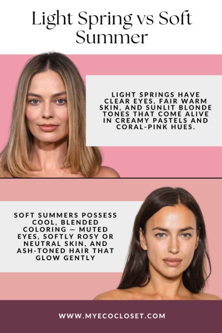 In terms of features, Light Springs usually have warm golden or peachy undertones, light blonde to golden brown hair, and clear blue, green, or light hazel eyes. Soft Summers lean cool or neutral-cool, with ash-toned hair, muted blue or gray-green eyes, and rosy skin that never looks golden.