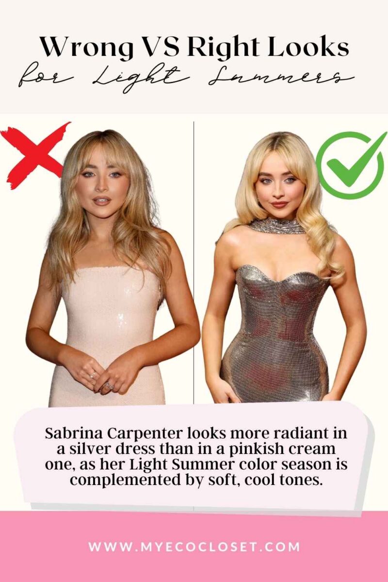 Light Summers, take notes! Wear soft, cool, and delicate tones to make yourself shine. If you don’t believe us, see it yourself: Sabrina Carpenter stuns in a silver dress that enhances her radiant complexion, while a pinkish-cream hue washes her out. Sasha Luss, another Light Summer beauty, glows in a soft pink floral gown, while harsh black overpowers her delicate features.