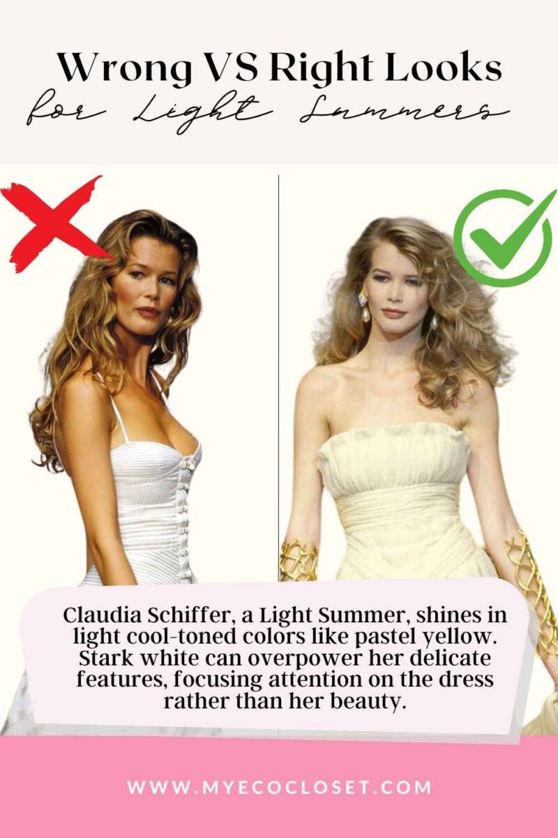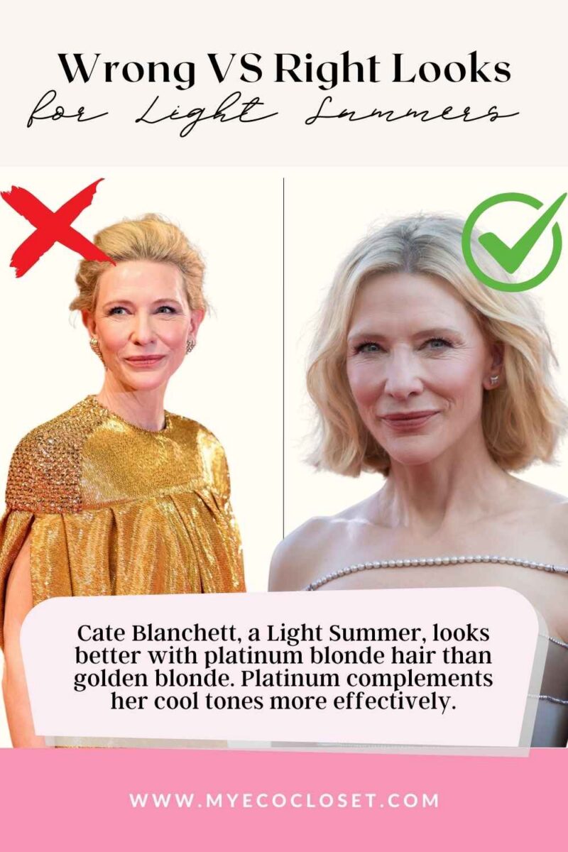 Light Summers thrive in soft, cool, and delicate hues! Claudia Schiffer proves that pastel yellow enhances her natural glow, while stark white overpowers her delicate features. Meanwhile, Cate Blanchett shines in platinum blonde, which harmonizes with her cool undertones — unlike golden blonde, which feels too warm.