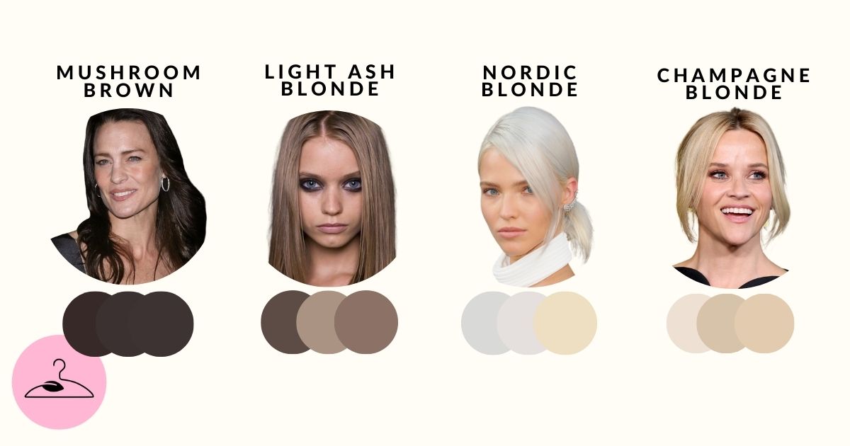 Cool, ashy tones like light ash blonde, Nordic blonde, and mushroom brown work best. These shades complement the delicate, cool undertones of Light Summer skin, creating a soft and balanced look while avoiding warmth that could clash with the complexion.