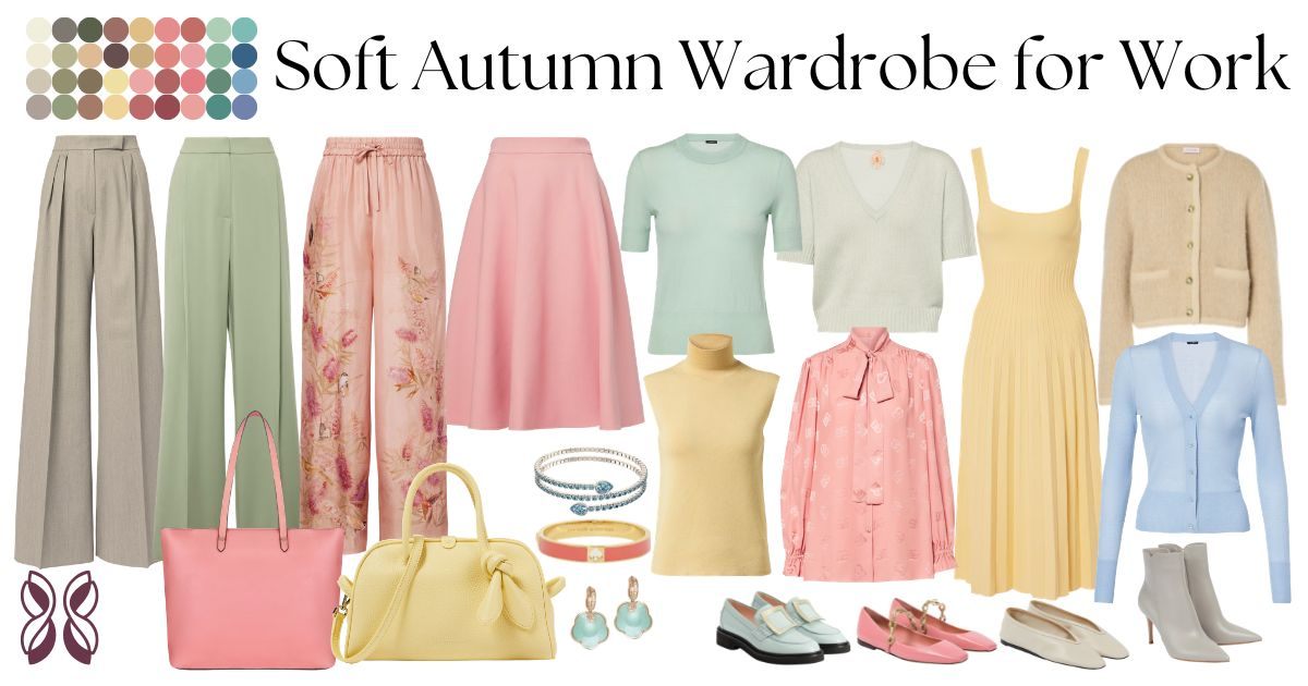 A Soft Autumn capsule for work should feel subtle, warm, and versatile. The goal is around 25–30 mix-and-match pieces that harmonize in muted tones. Unlike the drama of True or Deep Autumn, Soft Autumn clothes look best when low contrast and gently blended.