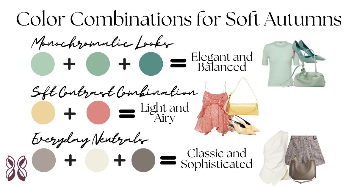 The key is depth variation, not contrast. Layer tones of similar softness, like taupe with dusty rose or moss green with muted coral. Small pops of accent color (used in scarves, shoes, or handbags) add personality while maintaining the gentle blending that defines the Soft Autumn palette.