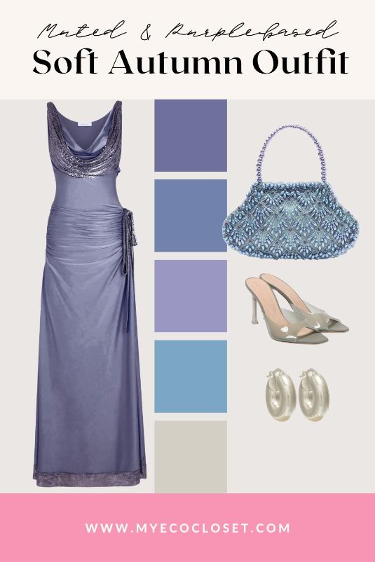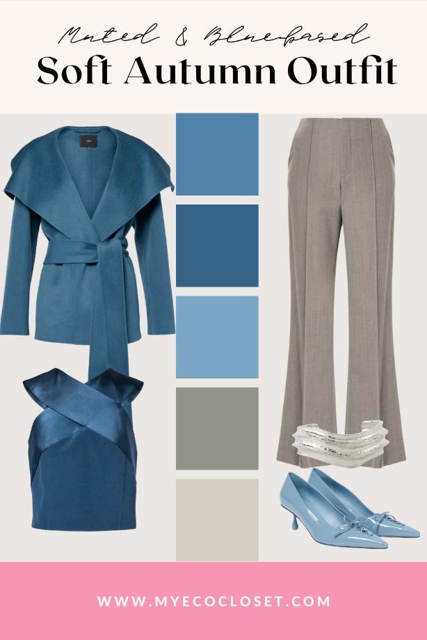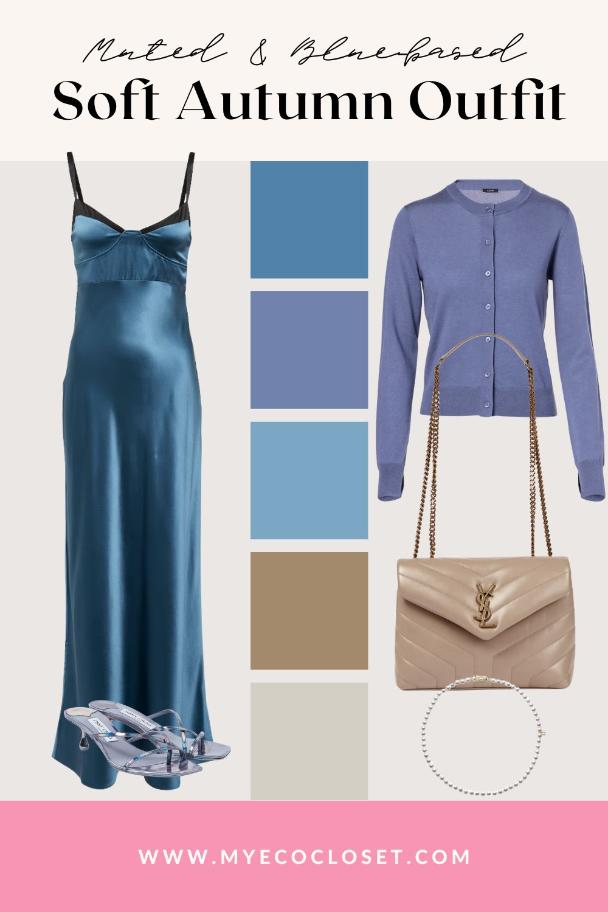 Similarly, the ideal Soft Autumn blue shades are never icy or vivid. They lean toward teal, dusty turquoise, and muted slate. A muted blue satin dress with pewter sandals and a taupe bag feels elegant, while a periwinkle cardigan over neutrals is easy for day. For an officewear look, try a dusty blue wrap coat with warm gray trousers.