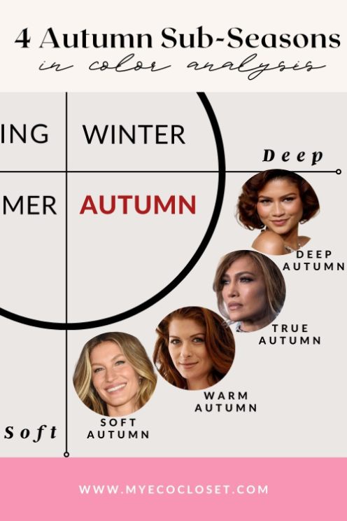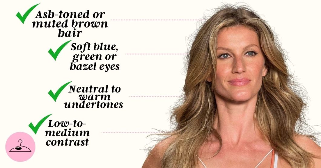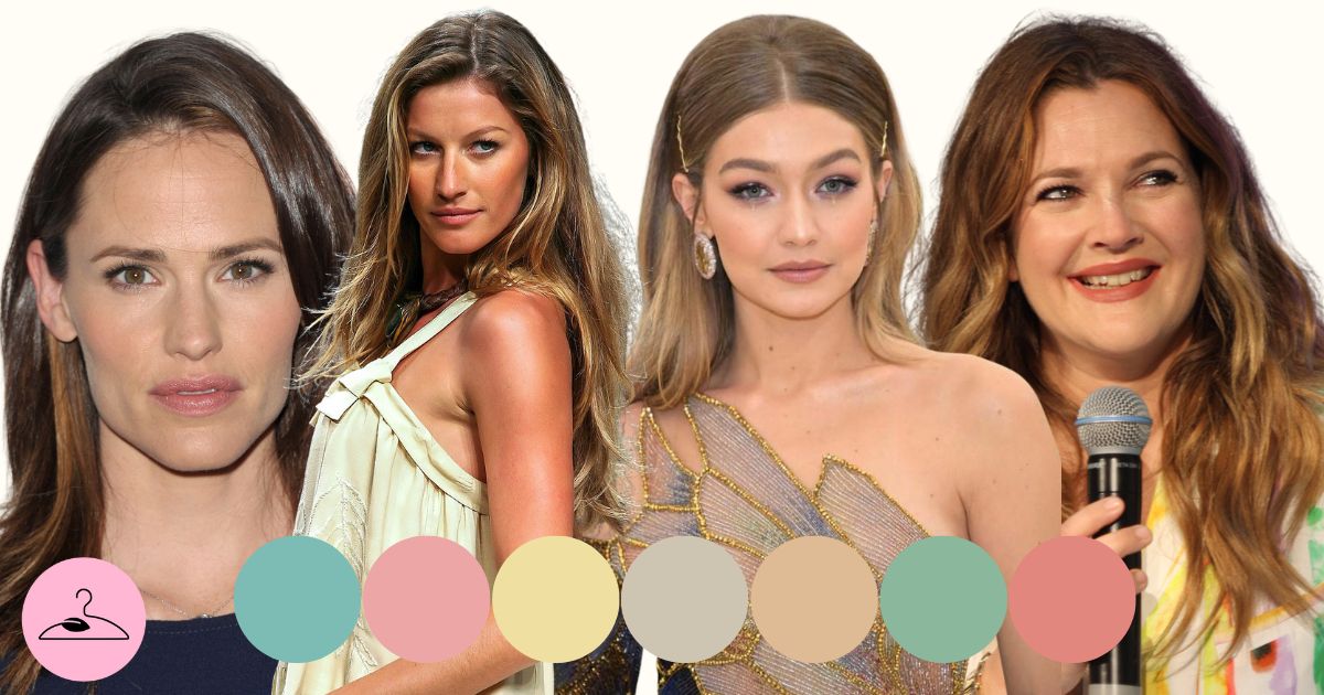 Several Soft Autumn celebrities illustrate the palette in real life. Gisele Bündchen embodies it with sunlit skin and hazel eyes in muted contrast. Lana Del Rey carries the palette’s inherent muted warmth, as her brown hair and hazel-green eyes blend with ease.