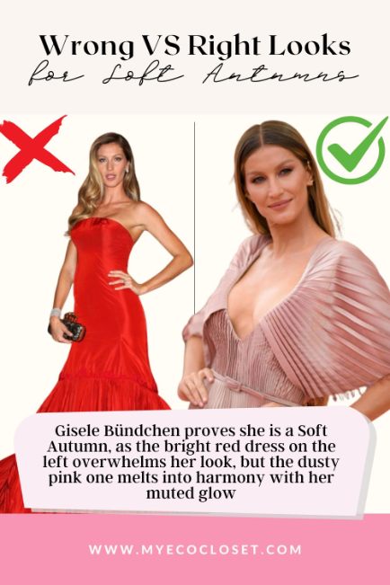 ✅ Right look: In a dusty pink dress, you can immediately notice the harmony. The muted warmth blends into Gisele’s natural, Soft Autumn coloring.