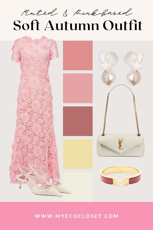 The best Soft Autumn pinks lean warm and natural: think salmon, rose, or terracotta pink. A muted pink dress with antique gold jewelry creates a balanced, romantic effect, while bright bubblegum or neon pinks disrupt your natural harmony.