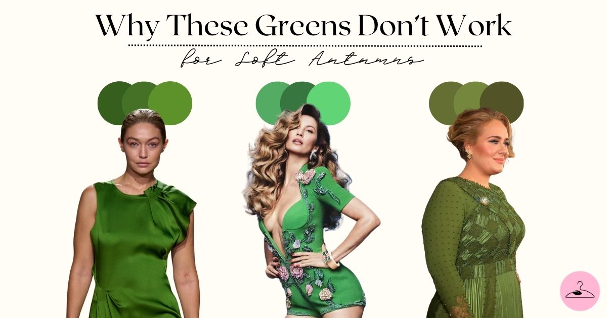 Even though green is technically flattering on many people, not all greens belong in your Soft Autumn wardrobe. Bright emerald and kelly greens are too vivid, pulling focus away from your face. Cool mints or aquas clash with your warmth, while neon limes feel jarring against your softer contrast.
