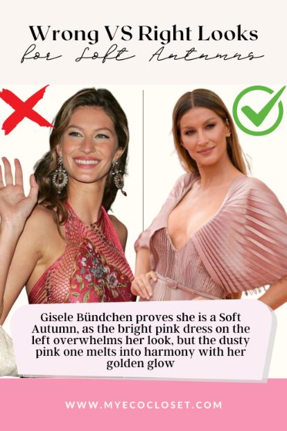 What’s most striking across these examples is the pattern: when these celebrities wear Soft Autumn’s muted, earthy palette, their features look naturally illuminated. Their skin appears smoother, eyes brighter, and overall presence more cohesive. But when they step into icy pastels, high-contrast black-and-white, or overly bright jewel tones, the clothes tend to “wear them” rather than the other way around.