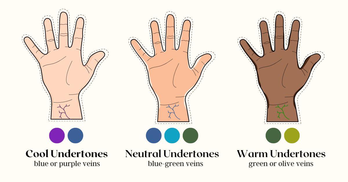 - Identify the color of your visible veins: If your veins appear predominantly blue, you likely have cool undertones. However, if they look more greenish, you probably have warm undertones. If they seem to be a mix of blue and green, or are simply difficult to categorize, you may have neutral undertones.