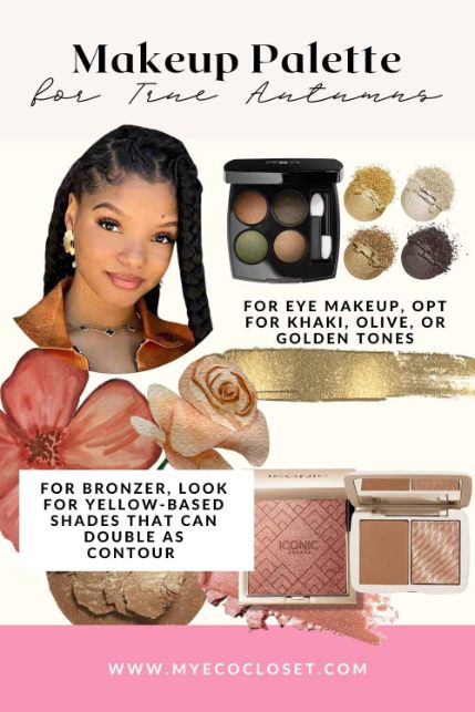 For flattering True Autumn eye makeup, reach for neutral shades like beige, khaki, warm browns, olive, and golden tones. These colors create a soft base that blends seamlessly with your complexion.