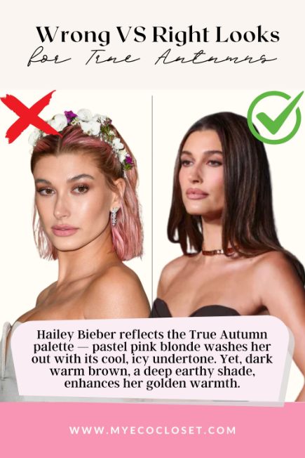 Similarly, at the Met Gala, Hailey Bieber’s pastel pink-blonde fell flat against her natural warmth. By contrast, her soft golden-brown hair enhances her Autumn coloring, adding depth and radiance.