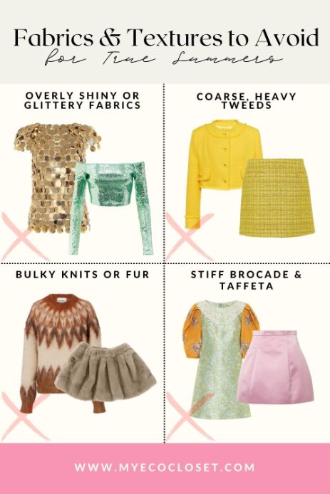 Skip heavy, shiny, or coarse materials, as they don’t complement True Summer clothes. This means that you should avoid tweed, satin, leather, or lamé, which can overpower the palette’s softness.