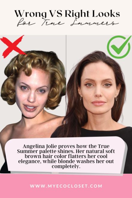 True Summers look best in cool, muted blondes like ash blonde, silver blonde, or beige blonde. These tones reflect the season’s understated palette. Very warm blondes, such as honey or golden blonde, tend to clash and add unwanted yellow undertones that disrupt the natural balance.