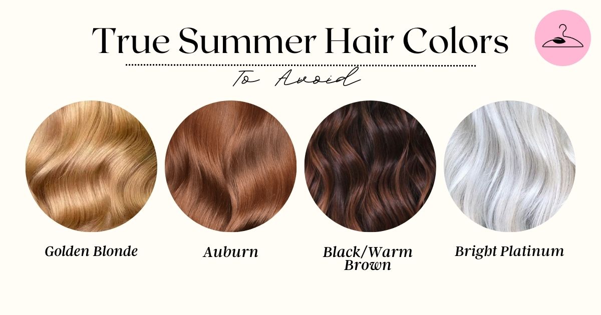Some shades can overwhelm or clash with True Summer softness, however. These would be anything warm and high-contrast, including: Golden blondes or caramel tones (too warm), Red or auburn shades (add unwanted orange), Black or espresso (too stark for the soft Summer contrast), and Bright platinum (can look artificial unless it has a soft ash base).