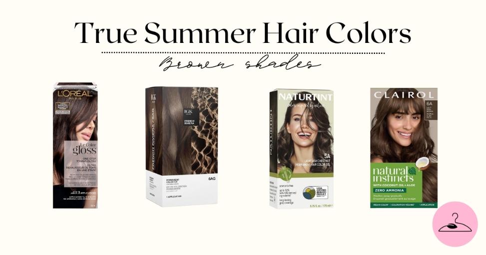 The best True Summer-friendly brunette shades include Cool Ash Brown, Muted Espresso, Slate Brown, and Soft Mink Brown, all of which stay within the cool, muted spectrum. Devoid of the heaviness or warmth of golden or red-based browns, these tones provide harmony with True Summer’s natural coloring.