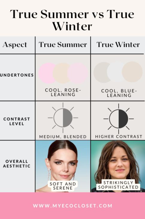 According to Carole Jackson’s classic Color Me Beautiful, both Summer and Winter fall on the cool side of the color wheel, meaning their best shades have blue undertones, not yellow ones. However, the following are the contrast-related distinctions between the two: