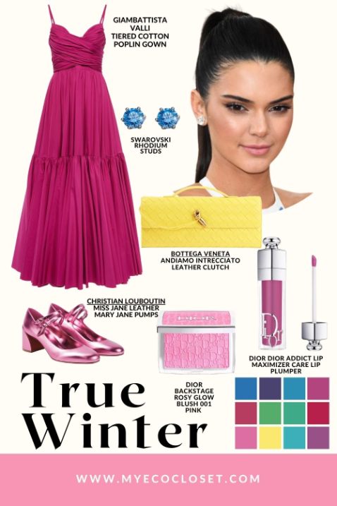 By contrast, True Winter clothes come in sharp, striking contrasts. Channeling Kendall Jenner, we’ve curated an outfit blueprint, featuring a fuchsia gown, metallic shoes, and sleek silver accents, which act as bold, bright touches and echo True Winter’s crisp, icy energy.