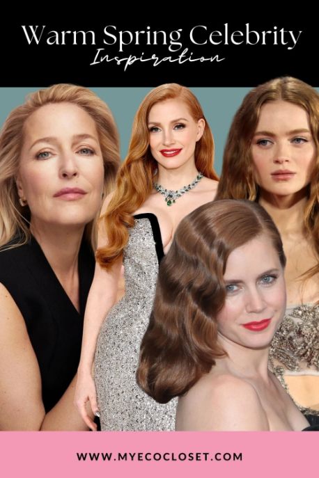 Some of the most recognizable Warm Spring women in the spotlight include Amy Adams, Jessica Chastain, Nicole Kidman, Sadie Sink, Kylie Minogue, and Gillian Anderson. What they share is golden or peachy skin, naturally warm hair tones, and clear eyes that come alive in bright, warm shades.