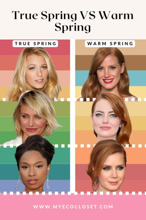 True Spring celebrities include Cameron Diaz, Blake Lively, and Kristen Bell, who glow in fresh, bright colors. Warm Spring celebrities such as Jessica Chastain, Nicole Kidman, Chloë Sevigny, Charlie Hunnam, Kylie Minogue, Gillian Anderson, Amy Adams, and Sadie Sink shine in softer, golden, autumn-leaning tones.